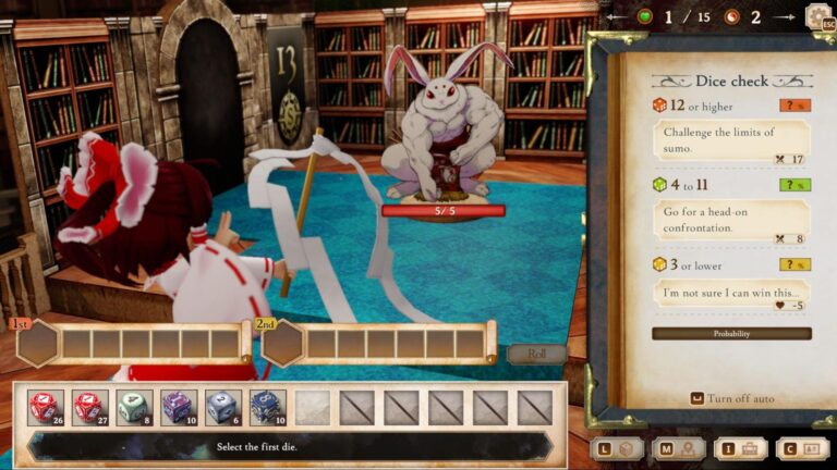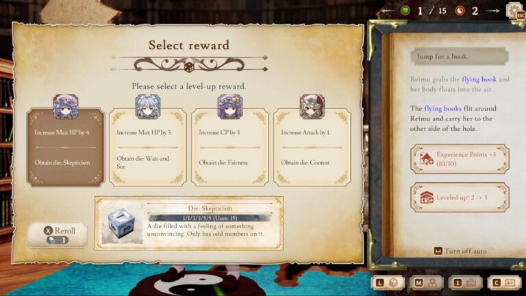 Still, even Reimu can’t reroll her dice as many times as you want. Turn your attention to the numbers in the upper-right corner of the screen.