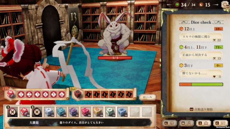 Reimu is attacking the strange rabbit and wants to get that really good result. Unfortunately, though, her dice only add up to 11. She needs 12 or higher to get that result, but she ended up getting something she didn’t wanted instead. You might think this whole thing is purely a game of chance!