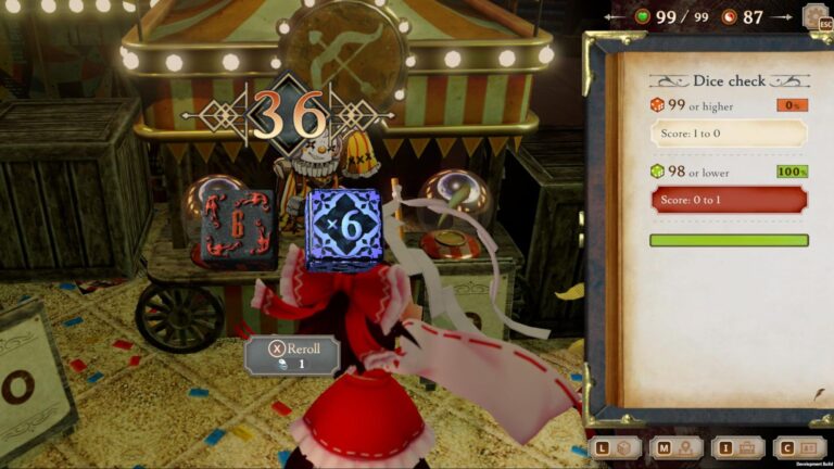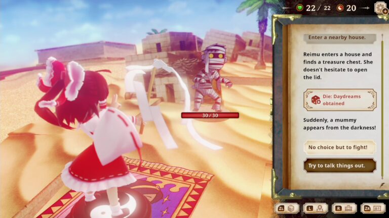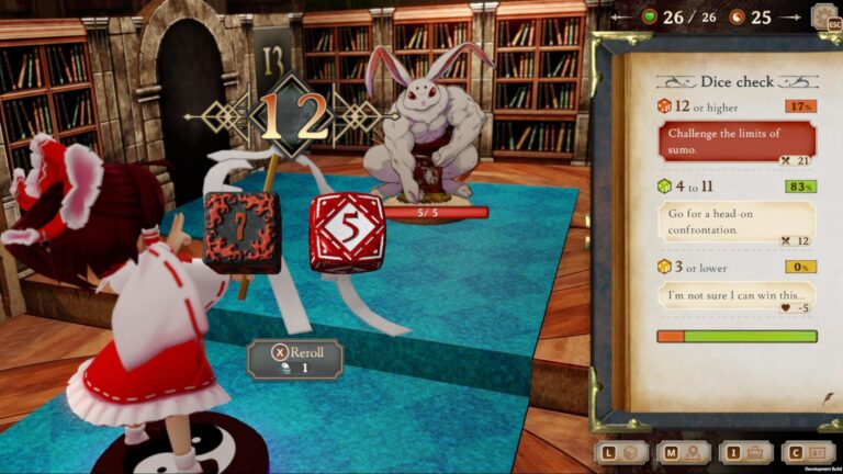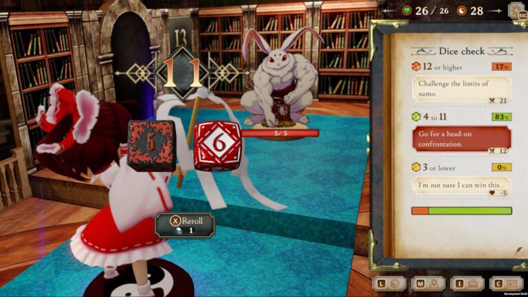 But wait just a moment. See that “Reroll” button below the two dice? You’re allowed to reroll the dice if you don’t like what you got. I guess Reimu has never really played by the rules anyway.