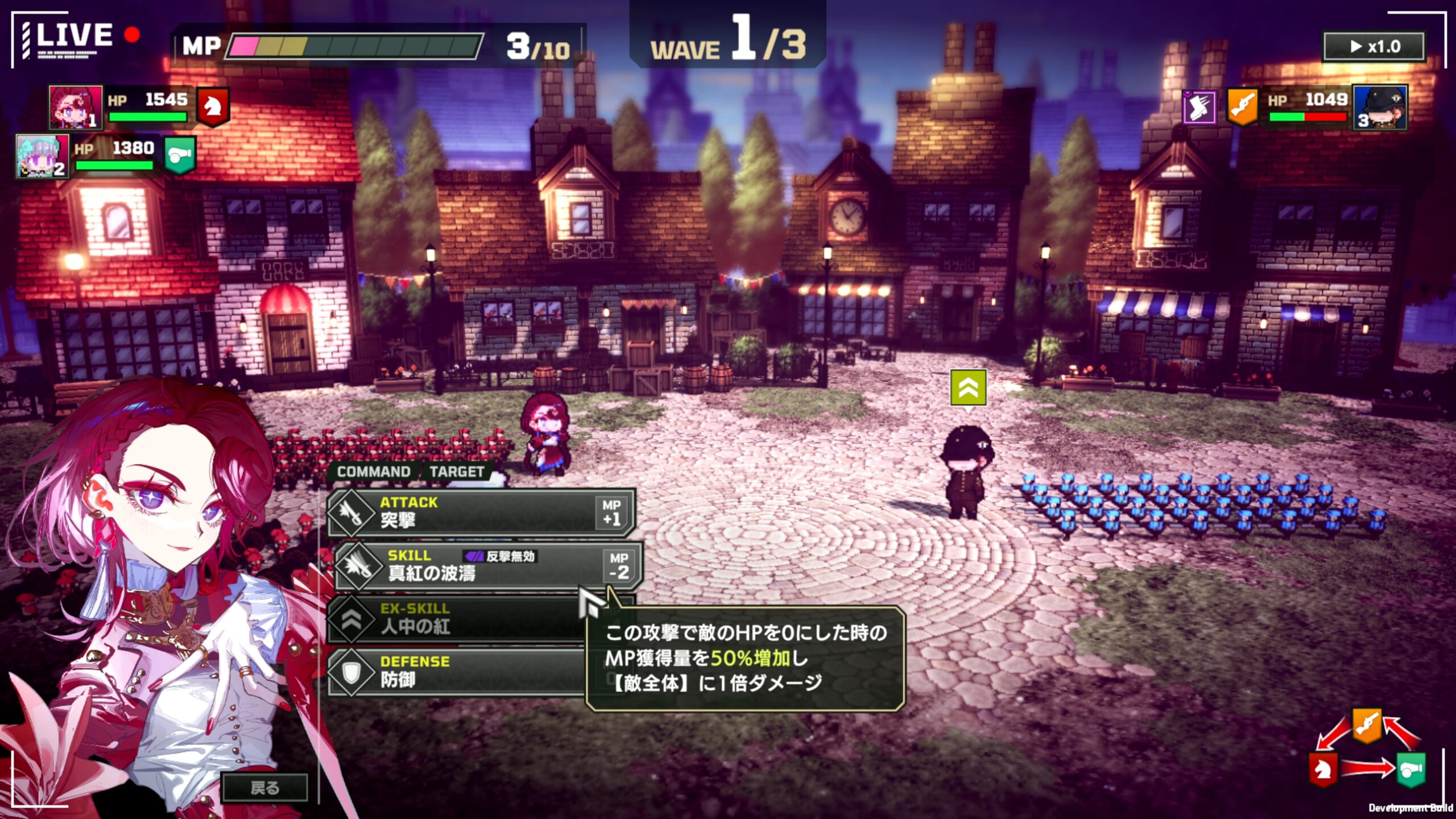 戦闘開始時にニコルは、味方部隊の防御力と機動力を下げるスキルを使用してきます。 集団戦になった場合は、スカーレットの全体攻撃スキル「真紅の波濤」で周囲の敵ごとまとめてダメージを与えるのが効果的です。