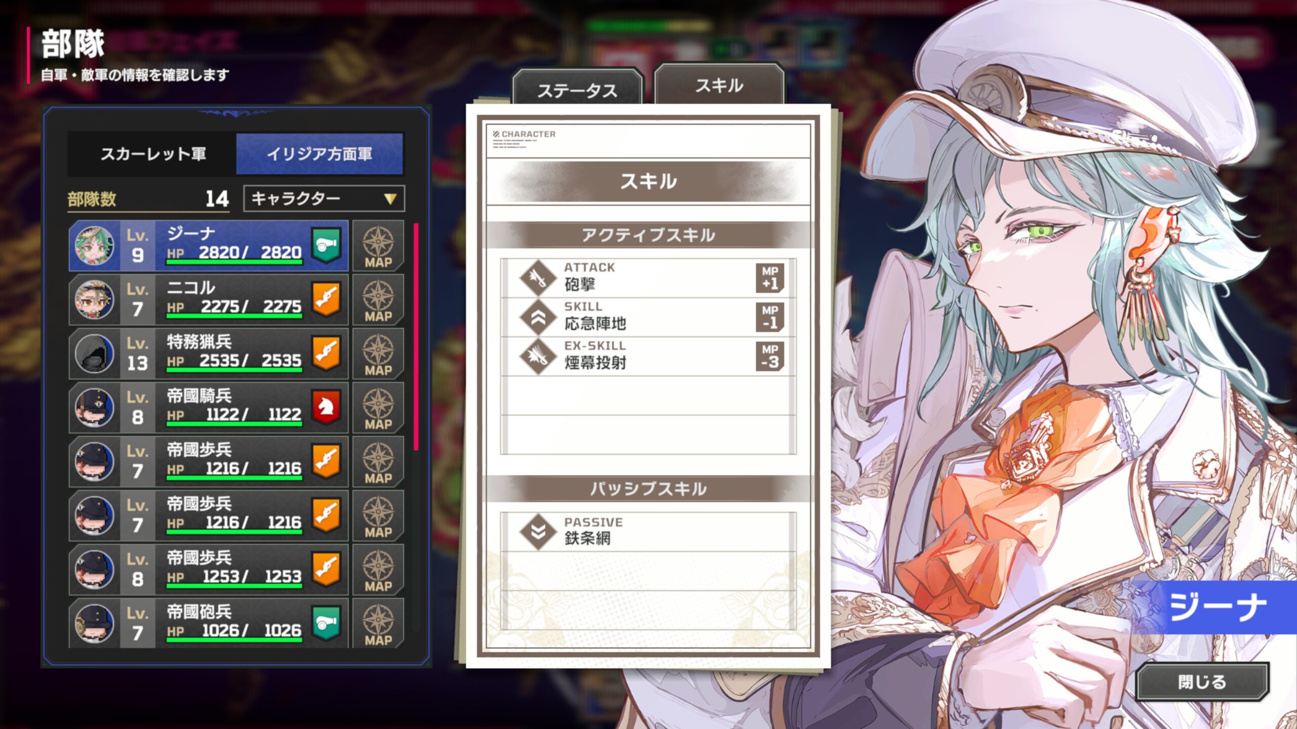 ➤ 「UNIT」:敵キャラクターや味方キャラクターの性能と、部隊の一覧を確認します。