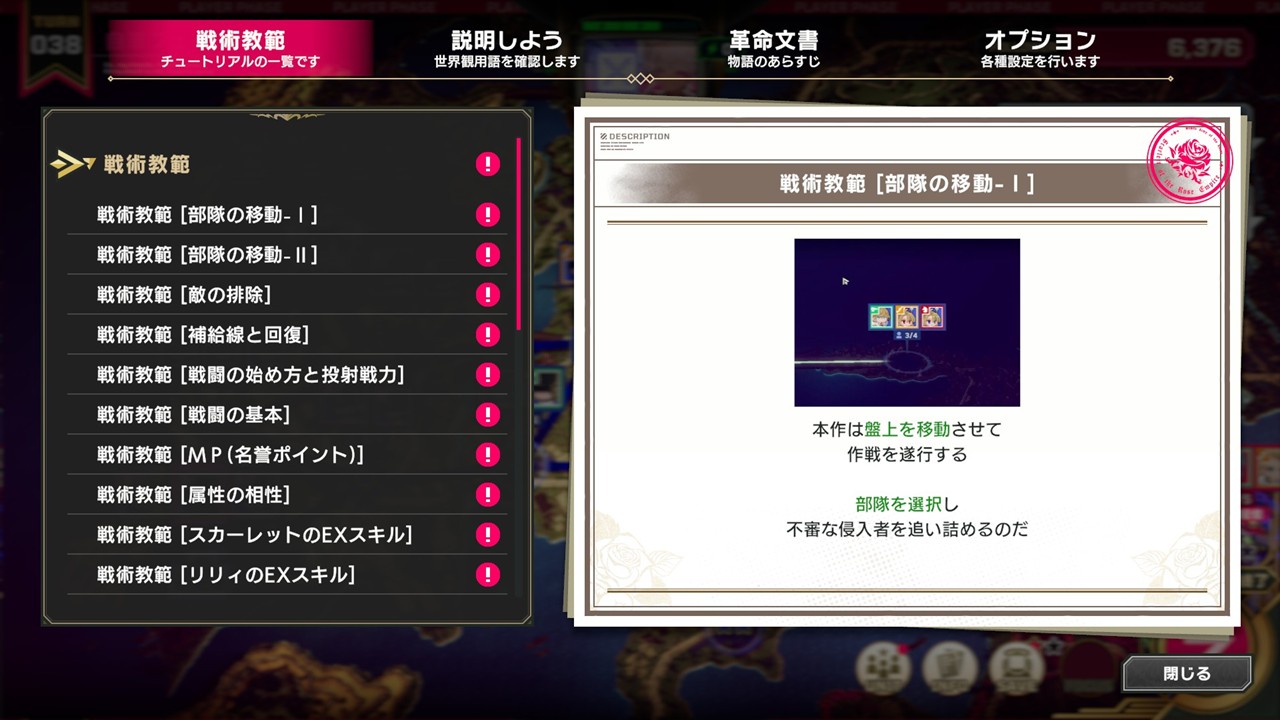 「INFO」メニューでは、ゲームの基礎的な操作やシステムが確認できる「戦術教範」と