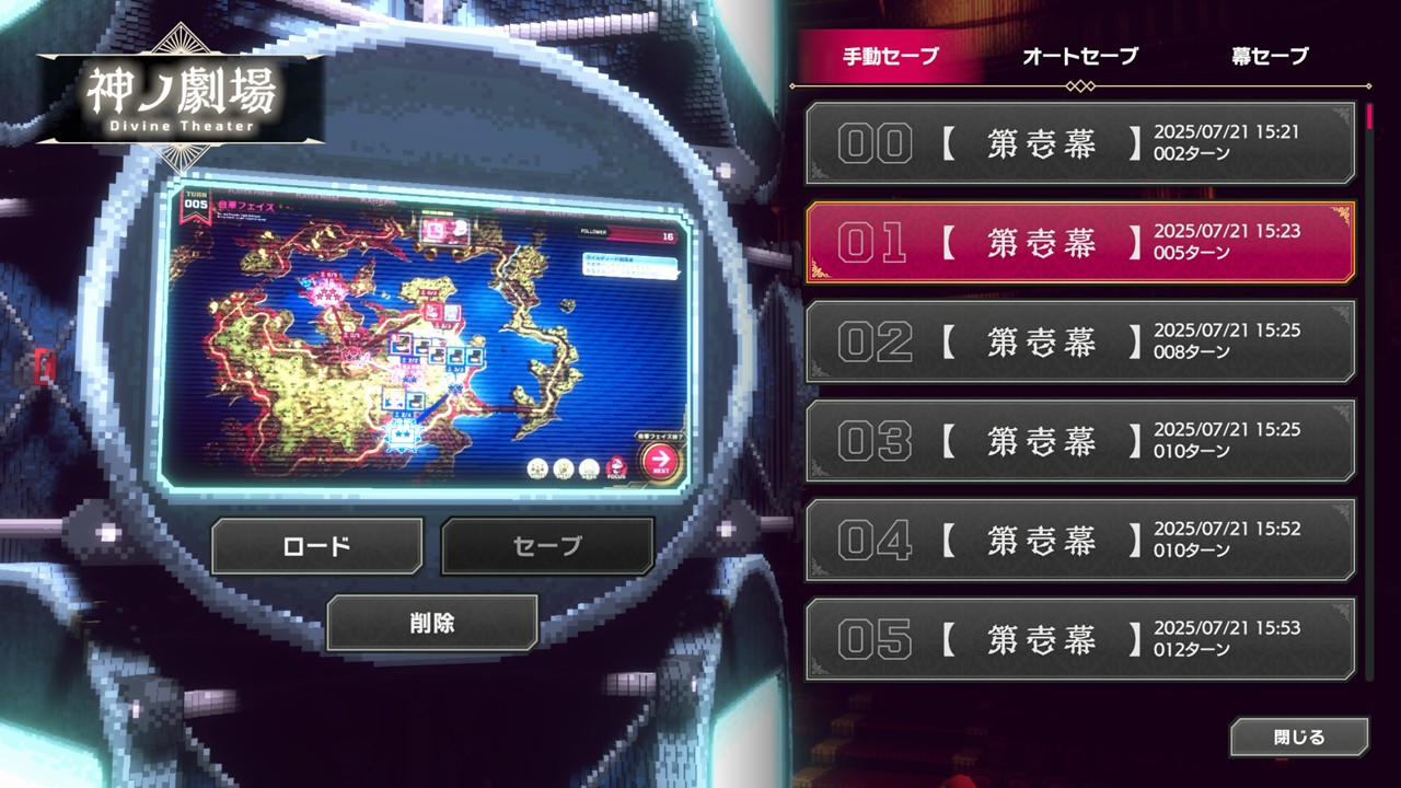 「オートセーブ」は10ターン分しか保存されないので、重要な局面では永続的に残る「手動セーブ」をすることをお勧めします。