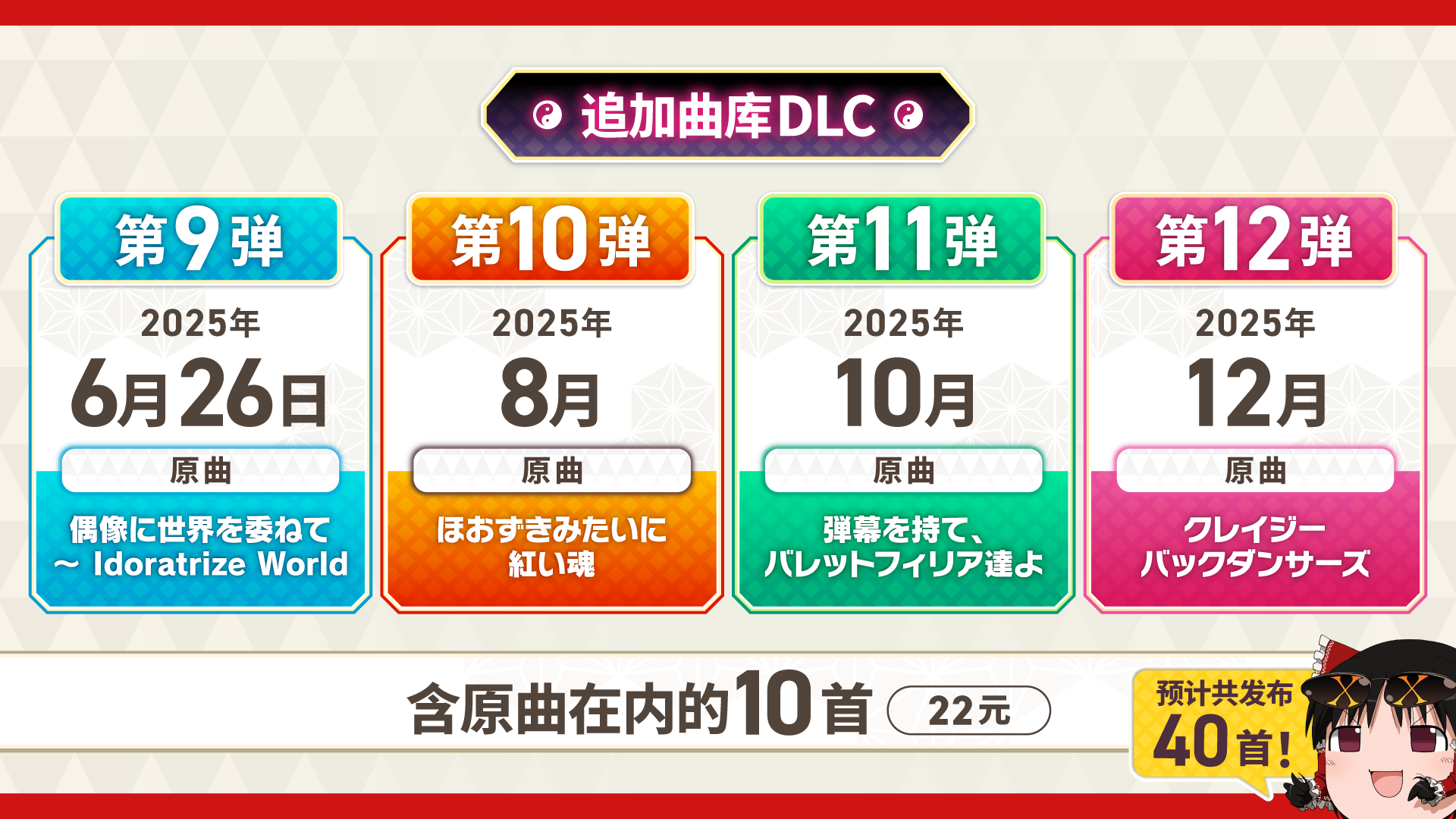 4弹DLC每弹将收录10首乐曲,其中各含有1首东方Project原曲,所收录原曲由ZUN从玩家们的呼声挑选而来。计划于6月26日的第9弹起,分4次陆续发售。